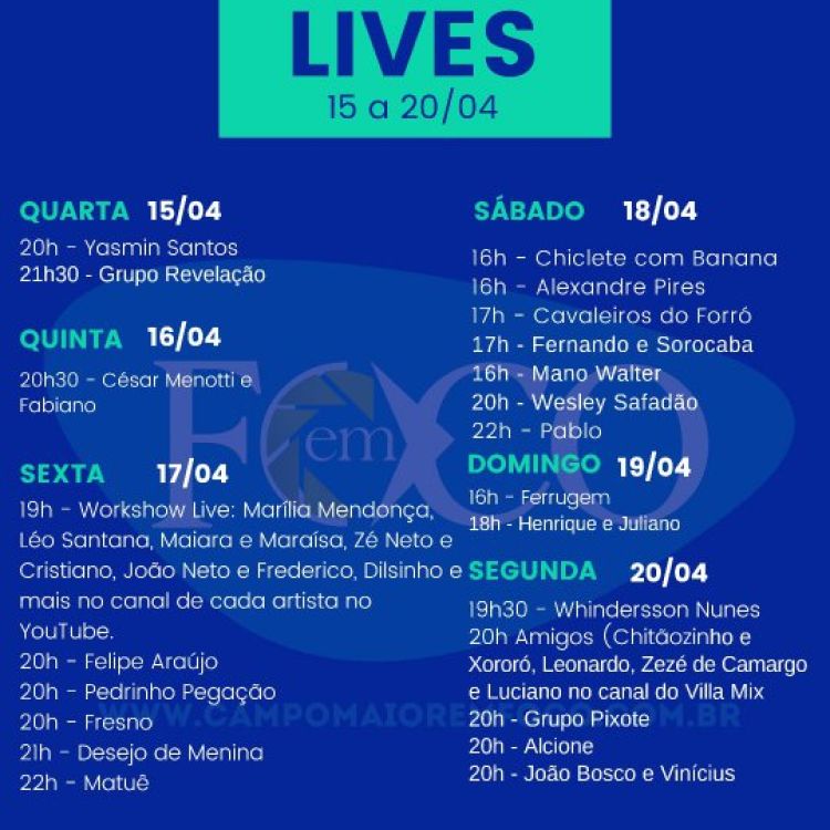 O certo é que agora temos as semanas recheadas de shows virtuais para todos os gostos. O Em Foco fez uma rápida busca e selecionou alguns das lives que serão realizadas do dia 15 a 20 de abril no youtube, confira: