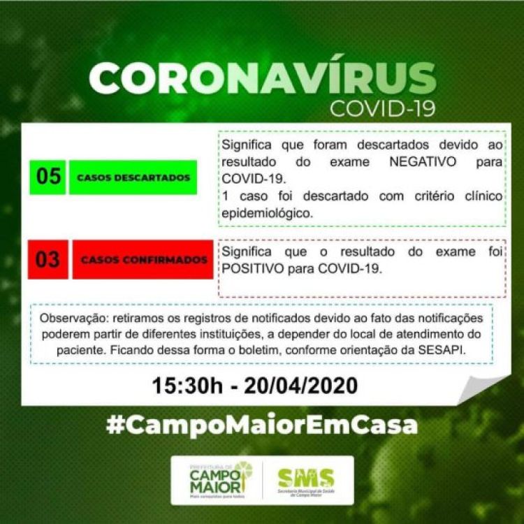 Foi divulgado na tarde desta segunda-feira (20) a confirmação do 3° caso confirmado de Covid-19 em Campo Maior. Não foi divulgado nenhum dado sobre o paciente.
