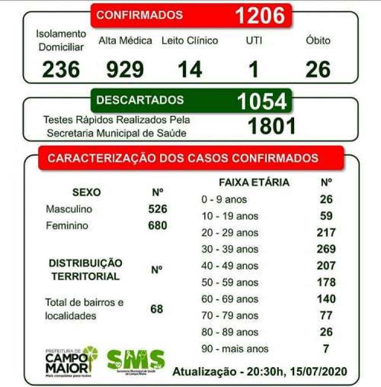 Campo Maior registrou três mortes nessa quarta-feira, 15, por COVID-19. Entre as vítimas fatais estão um homem, de 75 anos, e duas mulheres: uma de 63 anos e outra de 98 anos.