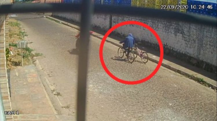 As imagens mostram o suspeito, ainda não identificado, sozinho em uma bicicleta vindo no lado direito da rua, pouco tempo depois o mesmo retorna carregando outra bicicleta infanto juvenil na cor rosa apenas com uma das mãos.