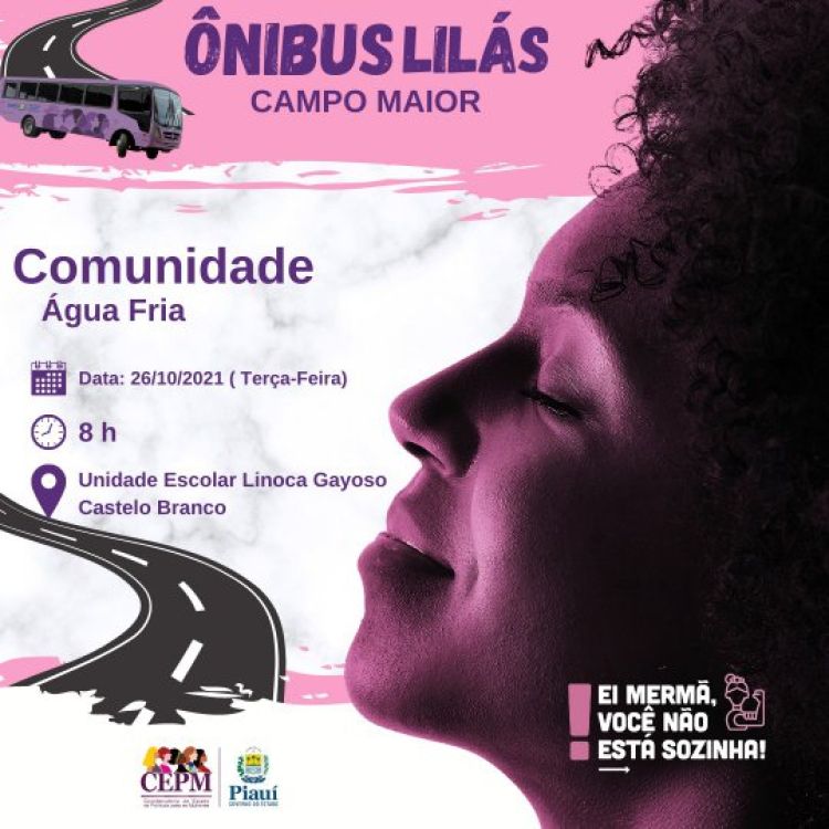 A Comunidade Água Fria na zona rural de Campo Maior (PI), receberá nesta terça-feira (26), a partir das 08hrs, o Ônibus Lilás, projeto do Governo do Piauí, através da Coordenadoria de Estado e Políticas para as Mulheres.