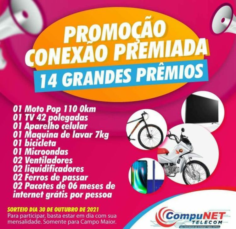 A CompuNET Telecom de Campo Maior comemora 10 anos levando internet de qualidade aos seus usuários de Campo Maior. Para festejar, realiza no próximo dia 03 de novembro o sorteio da promoção Conexão Premiada ao vivo pelo Facebook e Instagram da empresa às 18h.