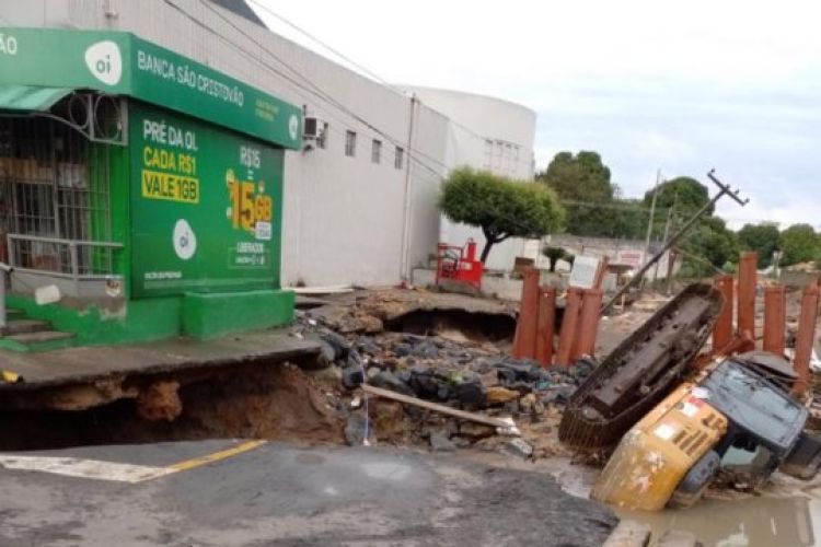 Parte do asfalto cedeu ao lado das obras da galeria da Zona Leste de Teresina, situada no cruzamento da Avenida Homero Castelo Branco com a rua Eustáquio Portela, e praticamente engoliu uma máquina escavadeira após fortes chuvas registradas na noite de sexta-feira (4) e madrugada de sábado (5).