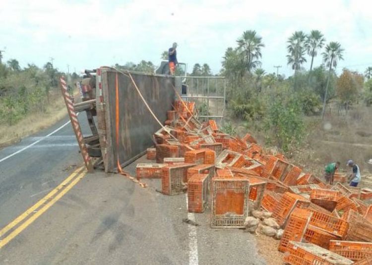 Um caminhão carregado de frango capotou no início da tarde deste sábado (24) após sobrar na conhecida “Curva dos Canudos” na PI-114, rodovia que liga Campo Maior a Cabeceiras do Piauí.