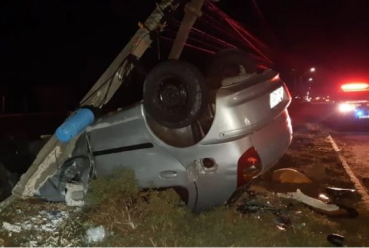 O veículo colidiu no meio fio e capotou fora da pista, onde houve uma segunda colisão contra um poste.