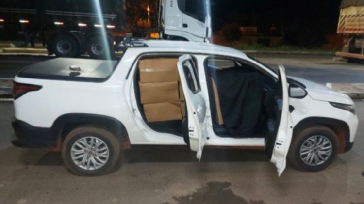 Ao verificar no interior do veículo, constatou-se que o mesmo estava preparado para transporte de ilícitos, completamente carregado com 20 caixas de cigarros de origem paraguaia.