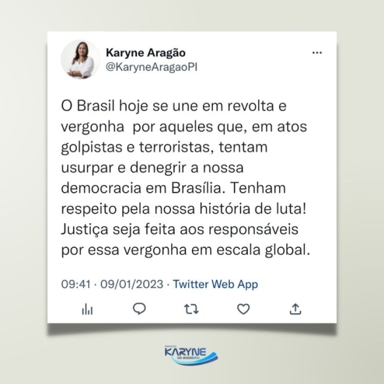A Prefeita de Cocal de Telha, Karyne do Rodrigão (PSD) manifestou seu repúdio às manifestações antidemocráticas realizadas neste domingo (08) em Brasília por apoiadores do ex-presidente Bolsonaro.