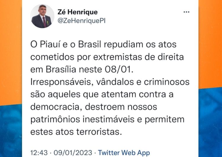“O Piauí e o Brasil repudiam os atos cometidos por extremistas de direita em Brasília neste 08/01. Irresponsáveis, vândalos e criminosos são aqueles que atentam contra a democracia, destroem nossos patrimônios inestimáveis e permitem estes atos terroristas”, manifestou o gestor através de suas redes sociais.