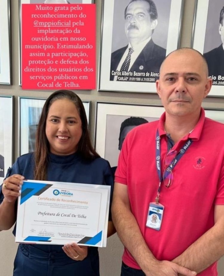 A Prefeitura de Cocal de Telha (PI) através da prefeita Karyne do Rodrigão recebeu nesta segunda-feira (PI) um certificado de mérito entregue pelo Ministério Público do Piauí.