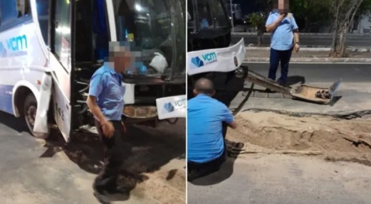 Um ônibus coletivo também ficou com as rodas presas em outros buracos que se abriram na Avenida 13 de Maio, na manhã da última segunda-feira (18), no bairro Vermelha, Zona Sul da capital.