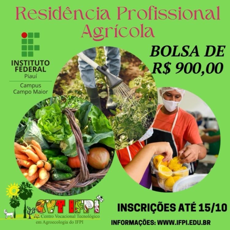 O Campus Campo Maior do IFPI publicou, nesta sexta-feira (6), edital para seleção de residentes bolsistas do Programa de Residência Profissional Agrícola. As cinco vagas são para estudantes concluintes e profissionais recém-egressos dos cursos técnicos de nível médio em Agricultura, Agroecologia, Agroindústria, Agropecuária e Zootecnia.
