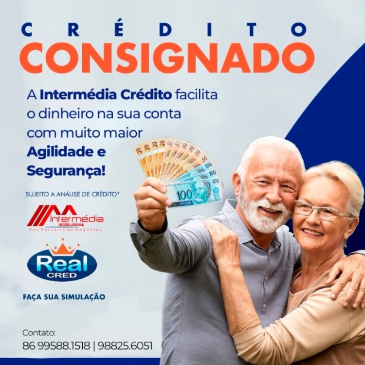 A INTERMÉDIA IMOBILIÁRIA em parceria com a REAL CRED oferece a você Credito Consignado, Credito para BPC/LOAS, Antecipação FGTS e muito mais. FÁCIL, RÁPIDO E SEGURO, com as melhores e taxa do mercado, não fique sem dinheiro. Corre até a Intermédia Imobiliária e faça uma simulação, estamos localizados na Rua Siqueira Campos, nº 120, Sala 13, Ao lado do supermercado J BRITO.