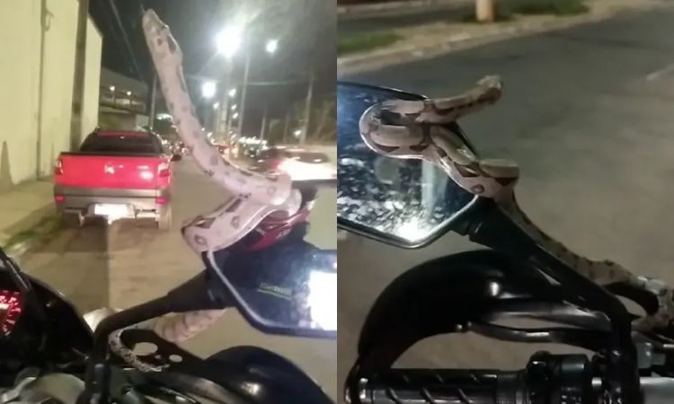 "Sempre deixo minha moto estacionada no mesmo local, próximo ao meu trabalho. Quando saí fui a um shopping e no caminho, fazendo a curva, senti algo tocando a minha mão, mas pensei que fosse algum inseto. Só depois percebi que era uma jiboia", explicou o homem.