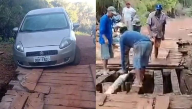 De acordo com os populares, a estrutura de madeira da ponte está puba, o que coloca em risco os usuários que dependem do local para travessia.