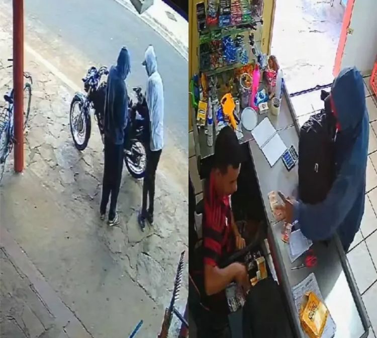 Em um dos comércios, câmeras de segurança registraram a ação. As imagens mostram um dos assaltantes entrando no estabelecimento enquanto o comparsa permanecia do lado de fora, dando cobertura. O criminoso que invadiu o local vestia uma jaqueta azul, boné e carregava uma mochila, onde guardou todo o dinheiro do caixa. O segundo suspeito, que também portava uma arma, usava uma camisa de manga longa. Ambos estavam em uma motocicleta modelo Fan, de cor preta.