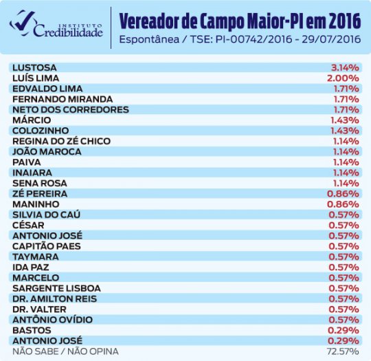 O Instituto Credibilidade divulgou nesta terça-feira (02) uma nova pesquisa para prefeito e vereador em Campo Maior. Na pesquisa para Prefeito, o pré-candidato Professor Ribinha (PT) aparece à frente com 32,86% das intenções de voto. O pré-candidato da oposição, Joãozinho Félix (PPS), é o segundo com 28,86%. O pré-candidato Marco Pereira (PTB) ficou na terceira colocação com 8,29% dos eleitores citando o seu nome e o Dr. Ribamar Coelho (PHS) foi mencionado por 2,57% dos entrevistados.