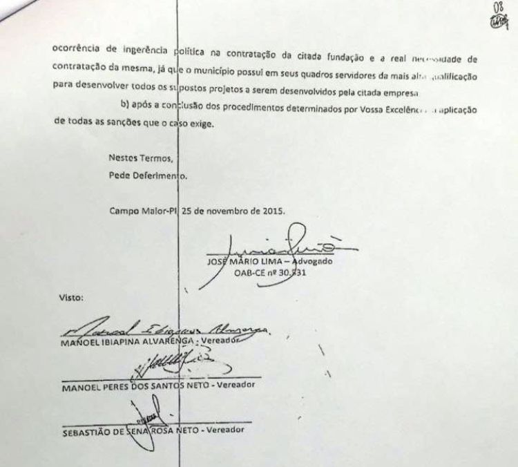 O convênio com a fundação, de acordo com o Prefeito Paulo Martins, veio para acabar com a contratação ilegal de servidores e dá garantias trabalhistas a eles. “Não se trata de uma terceirização de empresas e sim uma parceria público privada para a melhoria dos serviços públicos municipais. A Fundação além de permitir uma economia para os cofres públicos, pois é uma entidade sem fins lucrativos, dá tranquilidade com salário digno e direitos trabalhistas aos nossos servidores”, comentou o prefeito lamentando a ação da oposição. “Eles tiram os outros por eles. Nós não temos o costume de pagar salário atrasado, escravizar mão de obra e mal tratar servidores. Fazemos tudo dentro da legalidade e de forma transparente”, alfinetou o gestor se referindo a gestão do ex-prefeito João Félix que é o líder do grupo de oposição, ao qual os vereadores denunciantes são ligados.