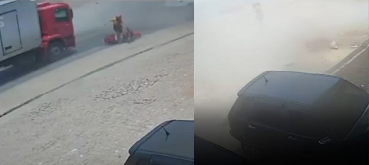 Uma câmera de segurança registrou o momento em que os ventos começaram, por volta das 11h40. A gravação mostra a poeira sendo levantada e, em seguida, uma mulher sendo derrubada da moto enquanto trafegava por uma avenida. Um caminhão que vinha logo atrás parou.