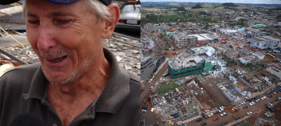 "A gente tem uma farmácia e saímos correndo, porque minha filha estava em casa. Chegamos lá, não deu dois minutos, começou a voar tudo. Voou telha, parede. Corremos para o banheiro, estourou também. Nos abraçamos e pedimos a Deus para nos proteger. O tornado durou 30, 40 segundos, e detonou tudo. Eu tenho dois carros, um deles voou dez metros. Parecia assim como se soltassem uma bomba atômica."