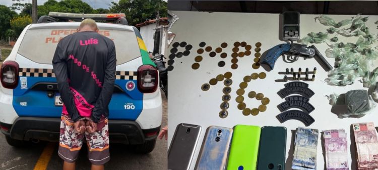 Na abordagem e durante a vistoria, os policiais localizaram uma arma de fogo, munições, entorpecentes e diversos materiais comumente utilizados no tráfico de drogas.
