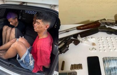 Durante a abordagem, os policiais apreenderam drogas, armas de fogo e outros materiais utilizados na atividade criminosa. Entre os itens apreendidos estão 40 porções de substância análoga a crack, uma porção de maconha, um revólver calibre 38 com seis munições, duas espingardas calibres 28 e 32, além de rádios comunicadores, balança de precisão, dinheiro em espécie e um aparelho celular.