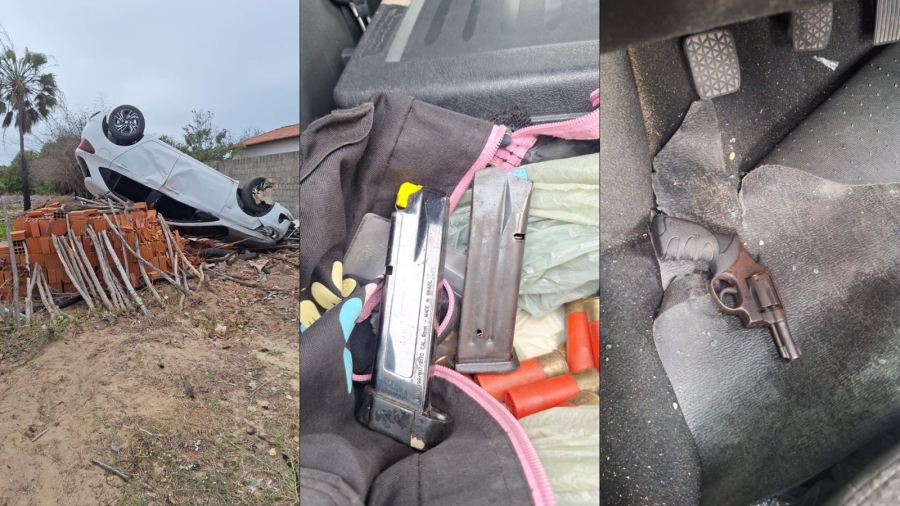 A Polícia Militar do Piauí apreendeu uma grande quantidade de munições e uma arma de fogo após suspeitos capotarem um veículo e fugirem para uma área de mata, no Conjunto Vitória, bairro Campos, em Luís Correia, no litoral do Piauí, no domingo (18). A ocorrência foi registrada após denúncias de disparos de arma de fogo na região.