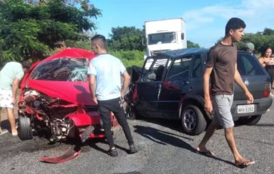 Após a colisão, a parte dianteira dos veículos ficou destruída e os carros ficaram na estrada bloqueando a via.