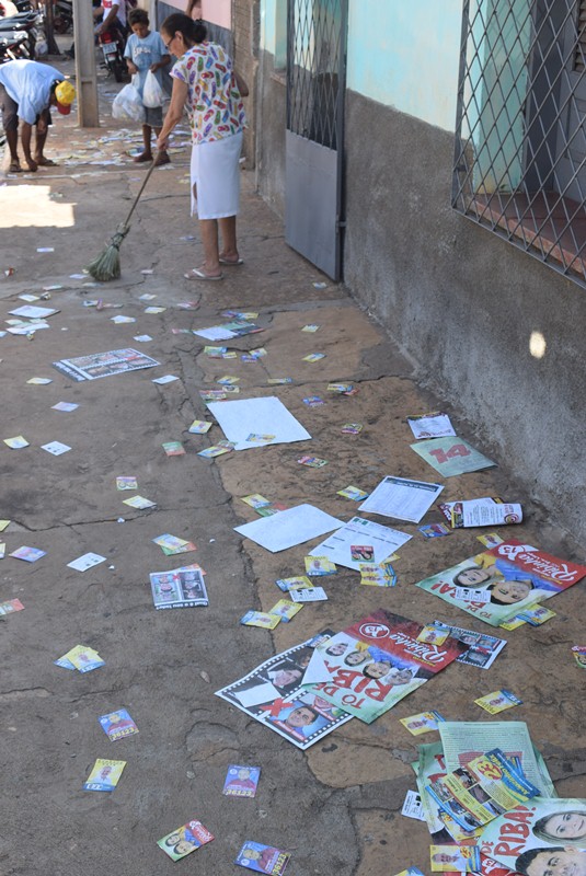Mesmo com a proibição do derrame de propagada próximo ou nos locais de votação, foi grande a quantidade de material político encontrado nas ruas e avenidas. Cartas propostas, santinho e adesivos estão espalhados nas entradas nos locais.