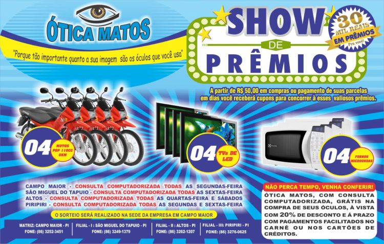 Para participar da promoção é bem simples: basta que você vá em qualquer uma das lojas da ótica Matos distribuídas entre os municípios de Campo Maior, São Miguel do Tapuio, Altos e Piripiri, realizar uma compra a partir de R$ 50,00 ou manter o pagamento das suas parcelas em dias e pronto, você receberá os cupons para concorrer aos prêmios.