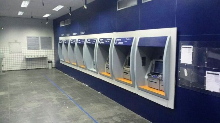 Na tarde do sábado (30), somente em três caixas era possível sacar algum valor. Em dois deles, somente nota de R$ 2,00 eram emitidas. Num terceiro, notas de R$ 5,00 e R$ 2,00 (é possível sacar até quatro notas por vez) No domingo, todos os equipamentos avisavam: “Este terminal não possui cédulas no momento”.