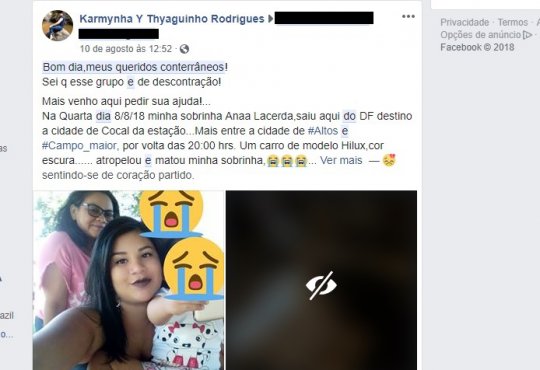 Uma postagem em rede social feita na sexta-feira anunciou a tragédia. Segundo a publicação, a adolescente saiu aqui do Distrito Federal com destino a cidade de Cocal da Estação, no norte do Piauí. Entre as cidades de Altos e Campo Maior, por volta das 20:00hrs. O ônibus em que a vítima e outras pessoas viajavam apresentou um problema mecânico e todos foram para um restaurante no outro lado da rodovia.