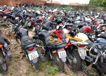 As motos estão sendo encobertas pelo mato e alguns estão viradas sobre outras motos. O pátio também tem carros. A secretaria diz que é responsabilidade da justiça