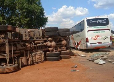 O ônibus ficou com sua parte dianteira parcialmente destruída e a carreta tombou para o acostamento