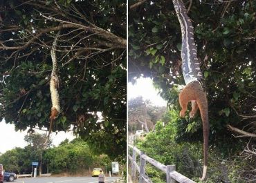 As duas observaram tudo por cerca de 15 minutos, mas o tempo não foi suficiente para ver o réptil, de aproximadamente 1,4 metro, terminar a refeição.