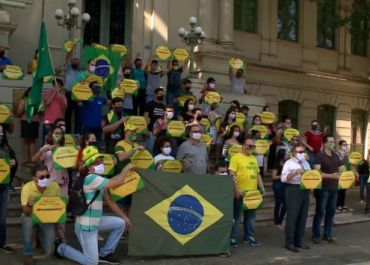 O grupo se uniu na escadaria do Palácio da Cidade, sede da prefeitura de Teresina, com bandeiras do Brasil e cartazes em verde e amarelo.