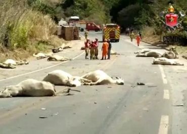 Motorista perde controle de carreta e mata 21 cabeças de gado na rodovia de Brasília (DF)