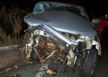 O impacto foi violento. Com a colisão, o Duster capotou fora da rodovia e incendiou.
