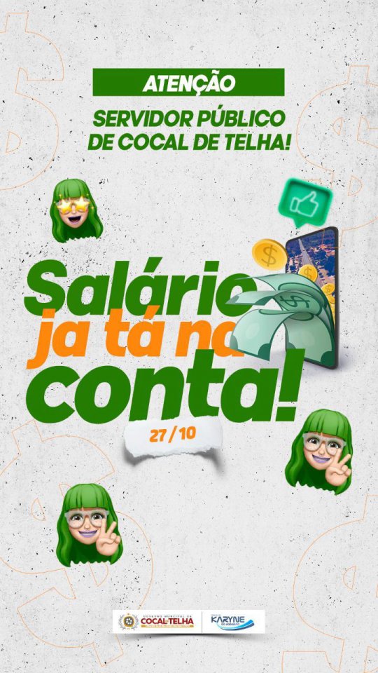 Na manhã desta quarta-feira (27), a Prefeita Karyne do Rodrigão, informou que o salário dos servidores municipais de Cocal de Telha (PI), já está na conta. A prefeita na ocasião reforçou a valorização dos profissionais em sua gestão, "Servidor Público Cocatelhense é valorizado e recebe o pagamento em dias", finalizou Karyne.